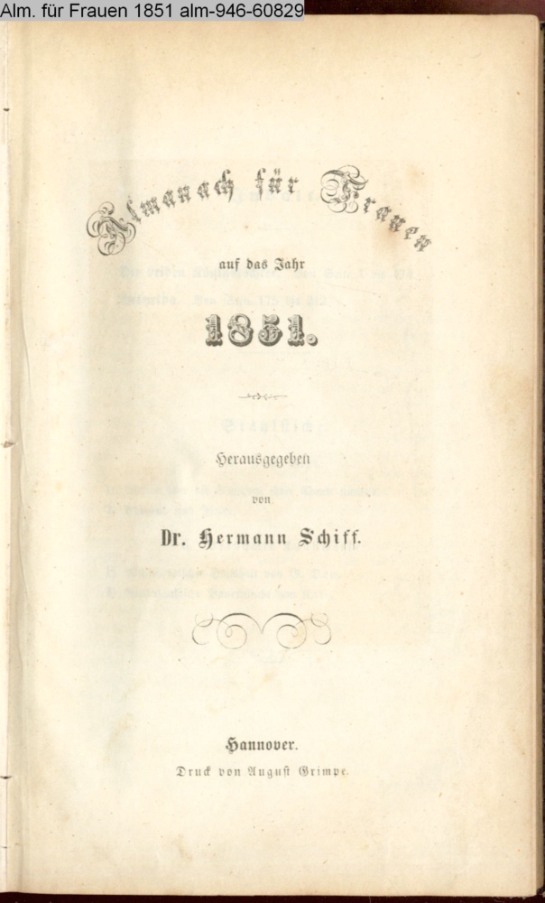 Almanach für Frauen / auf das Jahr / 1851. / Herausgegeben / von / Dr. Hermann Schiff. / Hannover. / Druck von August Grimpe
