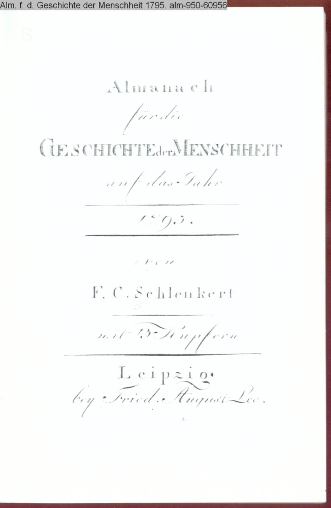 ALMANACH / für die / GESCHICHTE der MENSCHHEIT / auf das Jahr / 1795. / von / F. C. SCHLENKERT / mit 13 Kupfern / Leipzig / bey Fried. August Leo