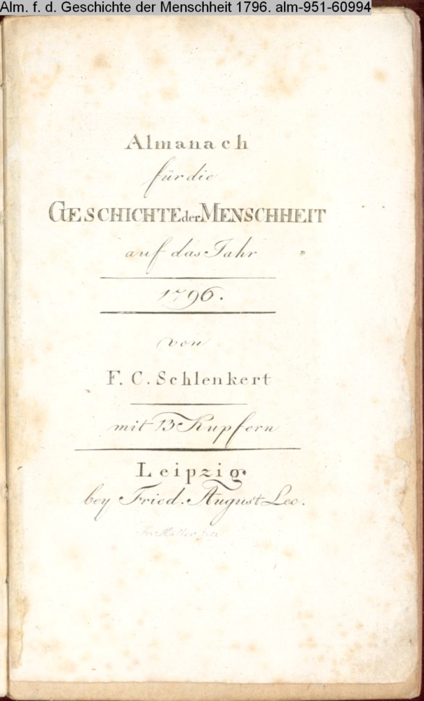 ALMANACH / für die / GESCHICHTE der MENSCHHEIT / auf das Jahr / 1796. / von / F. C. SCHLENKERT / mit 13 Kupfern / Leipzig / bey Fried. August Leo