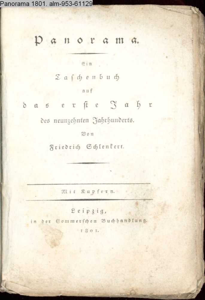 Panorama. / Ein / Taschenbuch / auf / das erste Jahr / des neunzehnten Jahrhunderts. / Von / Friedrich Schlenkert. / Mit Kupfern. / Leipzig, / in der Sommerschen Buchhandlung. / 1801