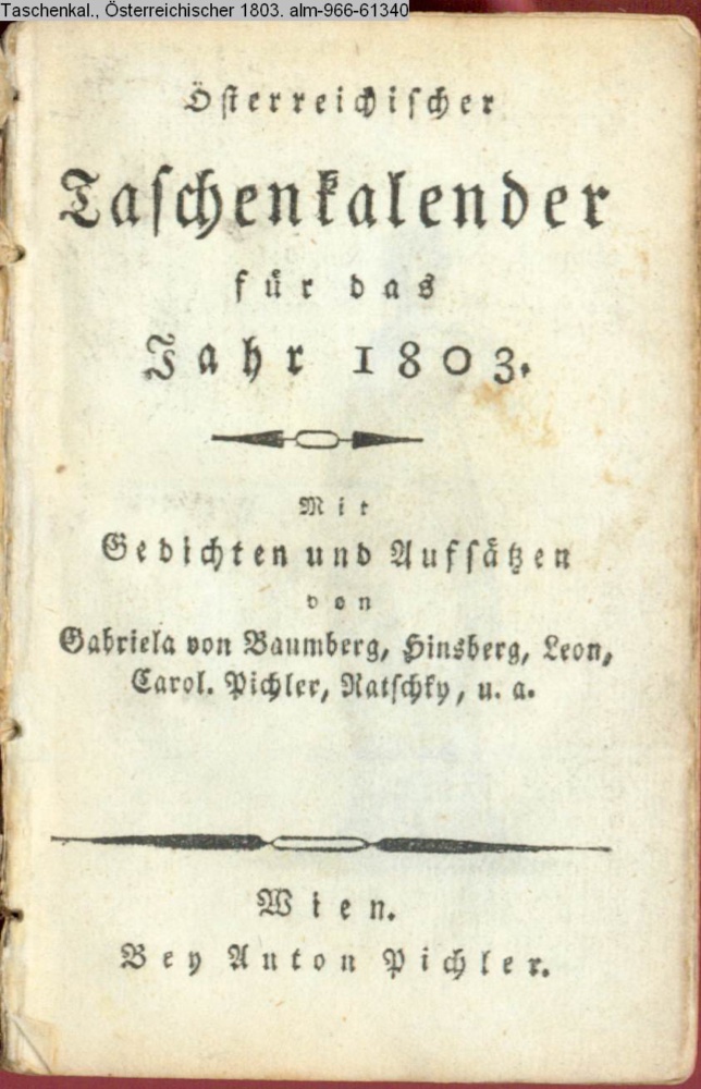 Österreichischer / Taschenkalender / für das / Jahr 1803. / Mit / Gedichten und Aufsätzen / von / Gabriela von Baumberg, Hinsberg, Leon, / Carol. Pichler, Ratzschky, u. a. / Wien. / Bey Anton Pichler