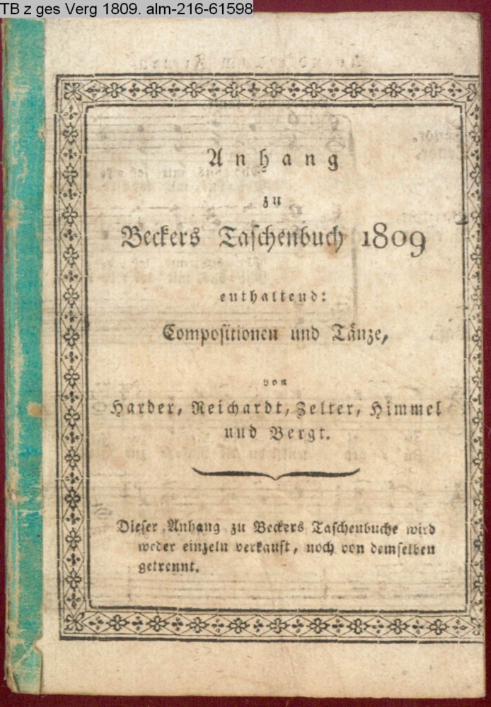 Anhang / zu / Beckers Taschenbuch / 1809. / enthaltend: / Compositionen und Tänze, / von Harder, Reichardt, Himmel / und Bergt. / Dieser Anhang zu Beckers Taschenbuche wird / weder einzeln verkauft, noch von derselben / getrennt