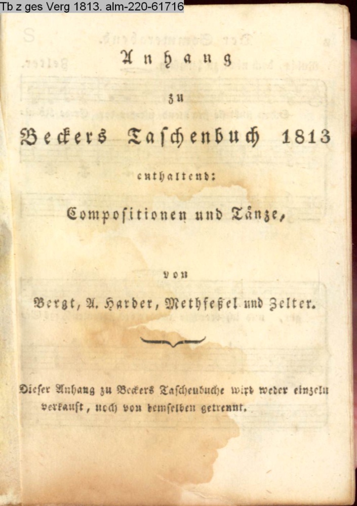 Anhang / zu / Beckers Taschenbuch 1813 / enthaltend: / Compositionen und Tänze, / von / Bergt, A. Harder, Methfeßel und Zelter. ( Dieser Anhang zu Beckers Taschenbuche wird weder einzeln / verkauft, noch von demselben getrennt)
