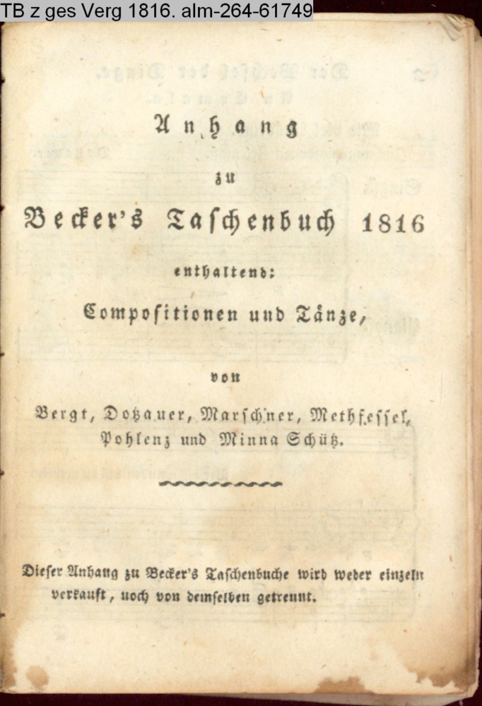 Anhang / zu / Becker's Taschenbuch 1816 / enthaltend: / Compositionen und Tänze, / von / Bergt, Dotzauer, Marschner, Methfessel, / Pohlenz und Minna Schütz. / Dieser Anhang zu Becker's Taschenbuche wird werder einzeln verkauft, noch von demselben getrennt