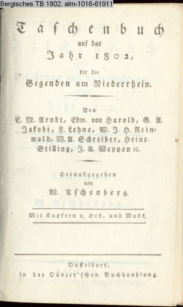 Taschenbuch / auf das / Jahr 1802, / für die / Gegenden am Niederrhein. / Von / E. M. Arndt, Edm. von Harold, G. A. / Jakobi, F. Lehne, W. J. H. Rein- / wald, W. A. Schreiber, Heinr. / Stilling, J. A. Weppen etc / Herausgegeben / von / W. Aschenberg. / Mit Kupfern v. Heß, und Musik. / Düsseldorf, / in der Dänzer'schen Buchhandlung