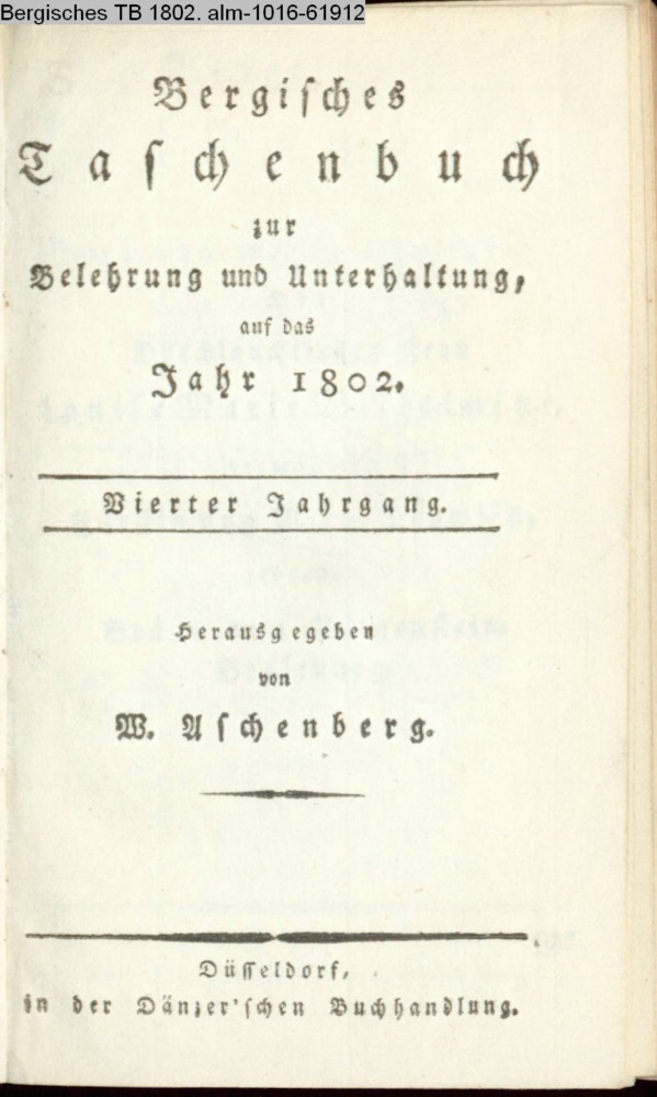Taschenbuch / auf das / Jahr 1802, / für die / Gegenden am Niederrhein. / Von / E. M. Arndt, Edm. von Harold, G. A. / Jakobi, F. Lehne, W. J. H. Rein- / wald, W. A. Schreiber, Heinr. / Stilling, J. A. Weppen etc / Herausgegeben / von / W. Aschenberg. / Mit Kupfern v. Heß, und Musik. / Düsseldorf, / in der Dänzer'schen Buchhandlung