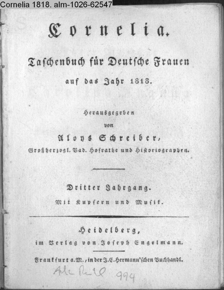 Cornelia. / Taschenbuch für Deutsche Frauen / auf das Jahr 1818. / Herausgegeben / von / Aloys Schreiber, / Großherzogl. Bad. Hofrathe und Historiographen. / Dritter Jahrgang. / Mit Kupfern und Musik. / Heidelberg, / im Verlag von Joseph Engelmann. / Frankfurt a. M., in der Herrmann'schen Buchhandlung