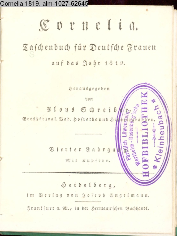 Cornelia. / Taschenbuch für Deutsche Frauen / auf das Jahr 1819. / Herausgegeben / von / Aloys Schreiber, / Großherzogl. Bad. Hofrathe und Historiographen. / Vierter Jahrgang. / Mit Kupfern. / Heidelberg, / im Verlag von Joseph Engelmann. / Frankfurt a. M., in der Herrmann'schen Buchhandlung