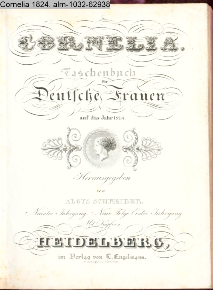 CORNELIA. / Taschenbuch / für / Deutsche Frauen / auf das Jahr 1824. / Herausgegeben / von / ALOYS SCHREIBER. / Neunter Jahrgang. Neue Folge. Erster Jahrgang. / Mit Kupfern. / HEIDELBERG, / im Verlag von J. Engelmann
