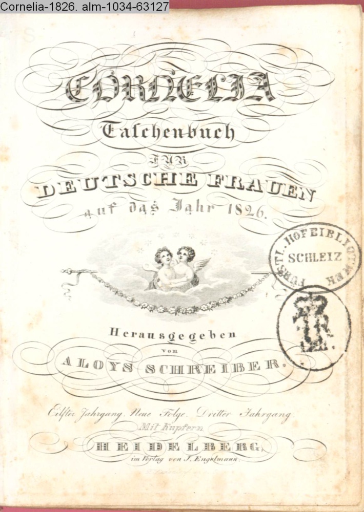 CORNELIA / Taschenbuch / für / DEUTSCHE FRAUEN / auf das Jahr 1826. / Herausgegeben / von / ALOYS SCHREIBER. / Eilfter Jahrgang. Neue Folge. Dritter Jahrgang. / Mit Kupfern / HEIDELBERG, / im Verlag von J. Engelmann