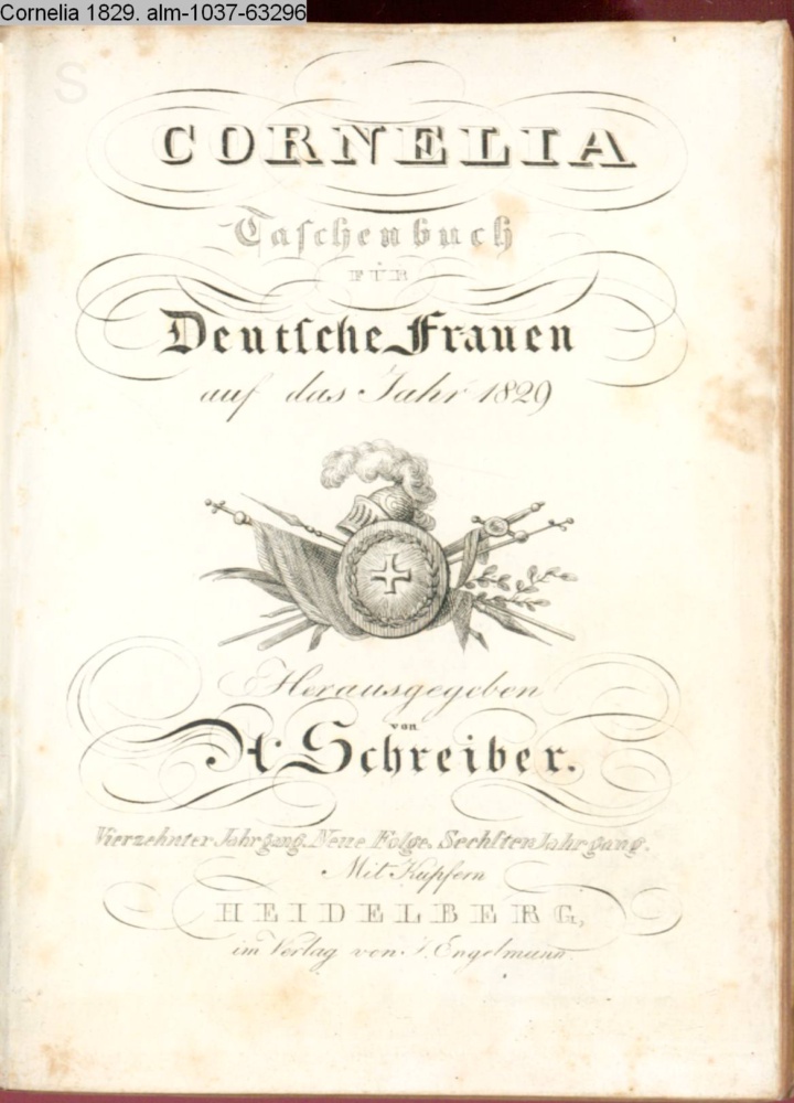 CORNELIA / Taschenbuch / FÜR / Deutsche Frauen / auf das Jahr 1829 / Herausgegeben / von / A. Schreiber. / Vierzehnter Jahrgang. Neue Folge. Sechster Jahrgang. / Mit Kupfern / HEIDELBERG, / im Verlag von J. Engelmann