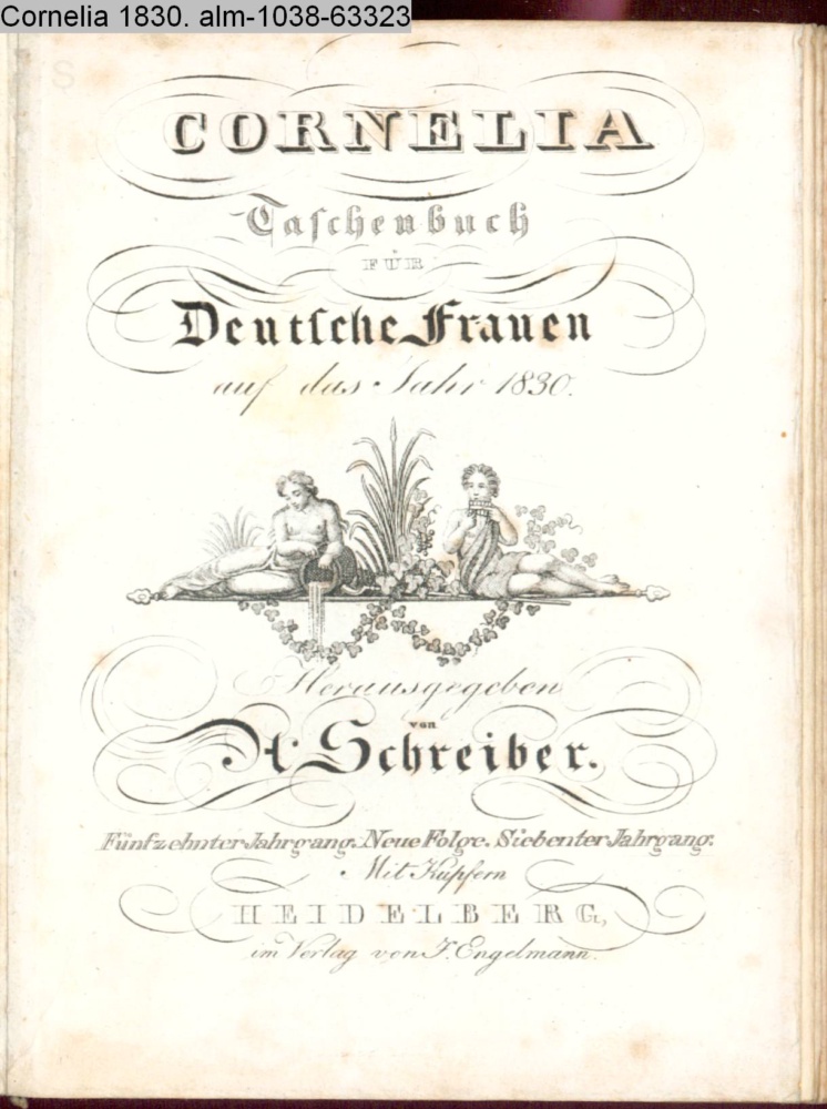 CORNELIA / Taschenbuch / FÜR / Deutsche Frauen / auf das Jahr 1830. / Herausgegeben / von / A. Schreiber. / Fünfzehnter Jahrgang. Neue Folge. Siebenter Jahrgang. / Mit Kupfern / HEIDELBERG, / im Verlag von J. Engelmann
