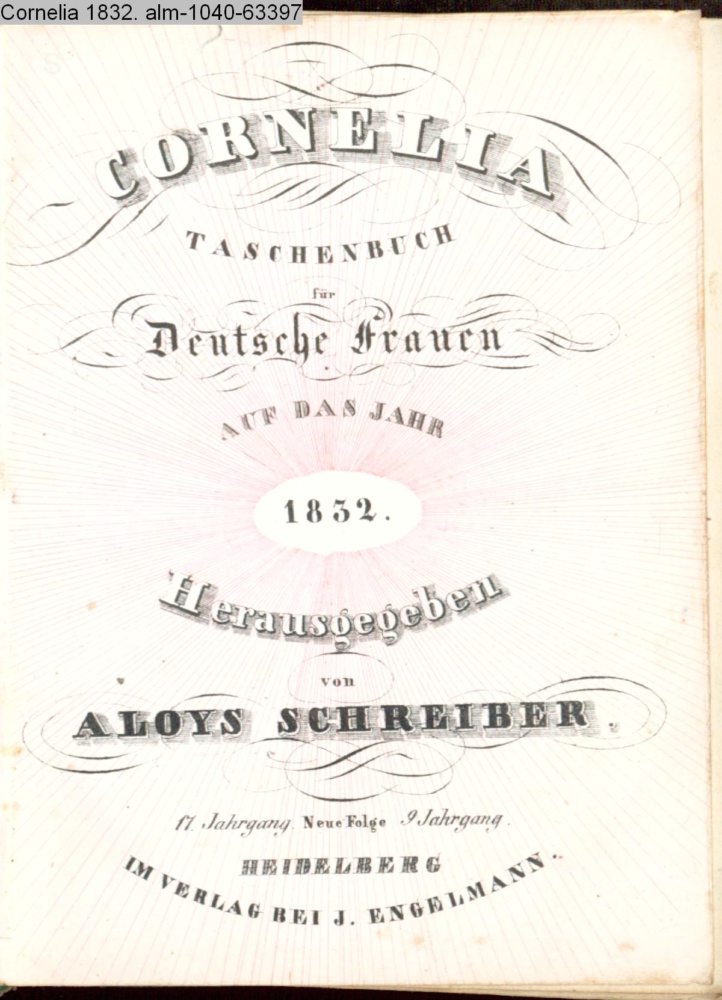 CORNELIA / TASCHENBUCH / für / Deutsche Frauen / AUF DAS JAHR / 1832. / Herausgegeben / von / ALOYS SCHREIBER. / 17. Jahrgang. Neue Folge 9. Jahrgang. / HEIDELBERG / IM VERLAG BEI J. ENGELMANN