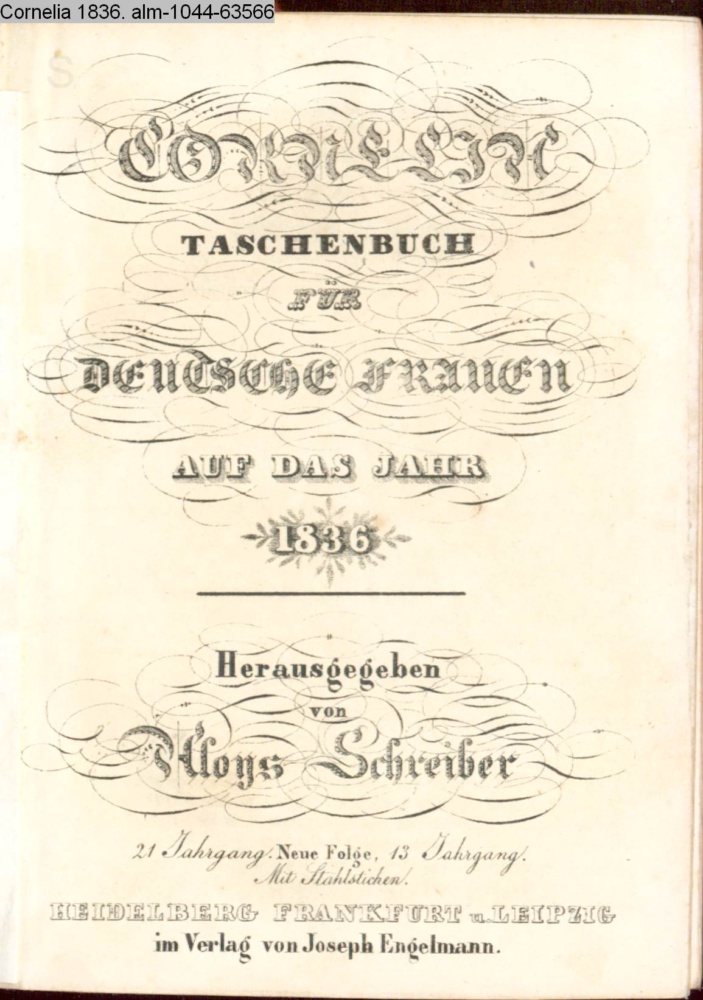 CORNELIA / TASCHENBUCH / Für / DEUTSCHE FRAUEN / AUF DAS JAHR / 1836 / Herausgegeben / von / Aloys Schreiber. / 21. Jahrgang. Neue Folge 13. Jahrgang / Mit Stahlstichen. / HEIDELBERG, FRANKFURT u. LEIPZIG / im Verlag von Joseph Engelmann
