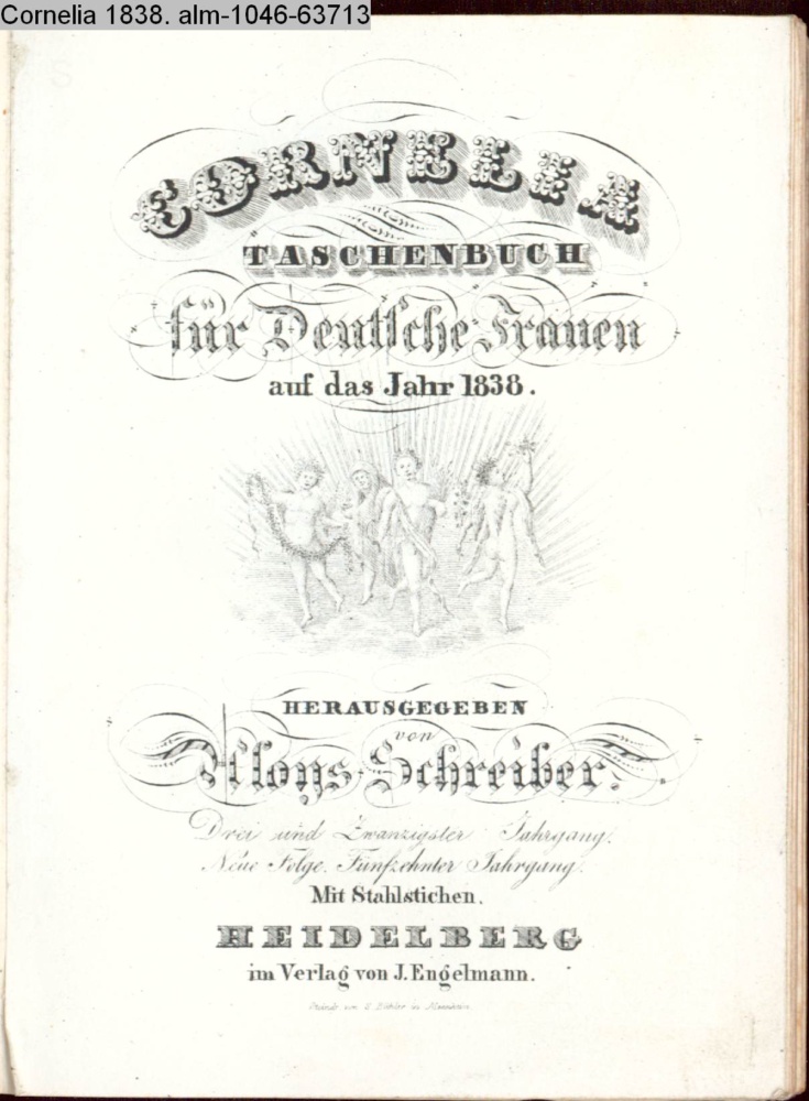 CORNELIA / TASCHENBUCH / für Deutsche Frauen / auf das Jahr 1838. / HERAUSGEGEBEN / von / Aloys Schreiber. / Drei und Zwanzigster Jahrgang. / Neue Folge. Fünfzehnter Jahrgang. / Mit Stahlstichen. / HEIDELBERG / im Verlag von J. Engelmann