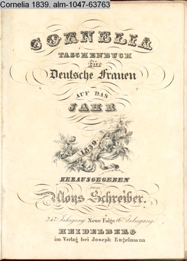 CORNELIA / TASCHENBUCH / für Deutsche Frauen / AUF DAS / JAHR / 1839. / HERAUSGEGEBEN / von / Aloys Schreiber. / 24r Jahrgang Neue Folge. 16r Jahrgang. / HEIDELBERG / im Verlag von Joseph Engelmann
