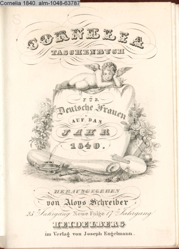 CORNELIA / TASCHENBUCH / FÜR / Deutsche Frauen / AUF DAS / JAHR / 1840. / HERAUSGEGEBEN / von Aloys Schreiber / 25r Jahrgang NEUE FOLGE 17r Jahrgang / HEIDELBERG / im Verlag von Joseph Engelmann