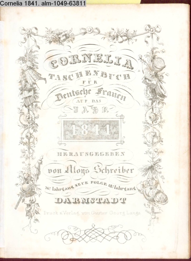 CORNELIA / TASCHENBUCH / FÜR / Deutsche Frauen / AUF DAS / JAHR / 1841. / HERAUSGEGEBEN / von Aloys Schreiber. / 26r Jahrgang NEUE FOLGE 18r Jahrgang / DARMSTADT / Druck & Verlag von Gustav Georg Lange