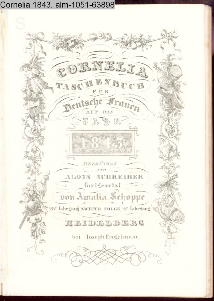 CORNELIA / TASCHENBUCH / FÜR / Deutsche Frauen / AUF DAS / JAHR / 1843 / BEGRÜNDET / von / ALOYS SCHREIBER / fortgesetzt / von Amalia Schoppe / 28r Jahrgang ZWEITE FOLGE 2r Jahrgang / HEIDELBERG / bei Joseph Engelmann