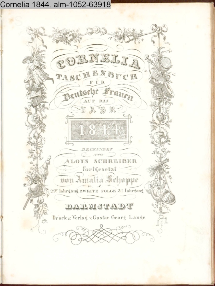 CORNELIA / TASCHENBUCH / FÜR / Deutsche Frauen / AUF DAS / JAHR / 1844 / BEGRÜNDET / von / ALOYS SCHREIBER / fortgesetzt / von Amalia Schoppe / 29r Jahrgang ZWEITE FOLGE 3r Jahrgang / DARMSTADT / Druck & Verlag v. Gustav Georg Lange