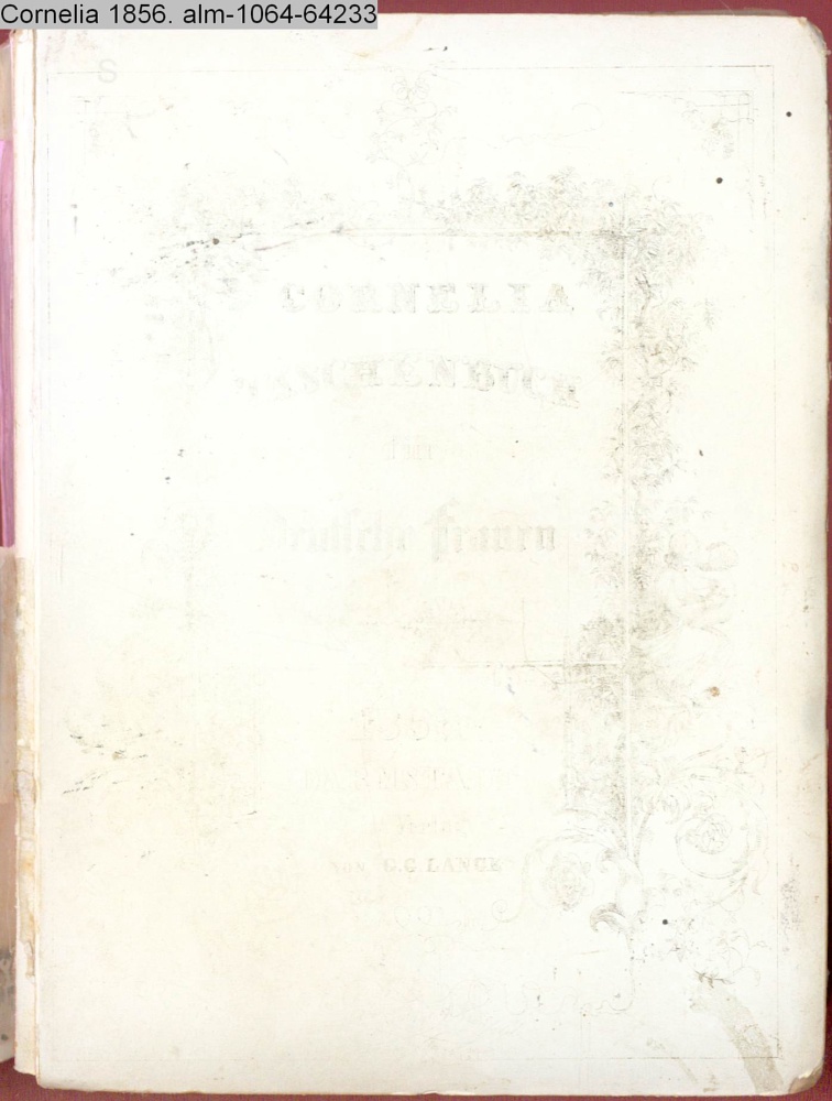 CORNELIA / TASCHENBUCH / für / Deutsche Frauen / 1856 / DARMSTADT / im Verlag / VON G. G. LANGE / New-York Lange & Kronfeld / William Street 202. Store No. 3