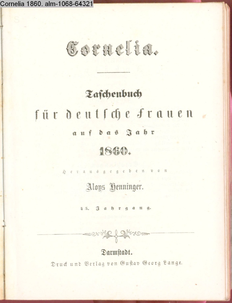CORNELIA / TASCHENBUCH / FÜR / Deutsche Frauen / auf das / JAHR / 1860 / BEGRÜNDET / VON / ALOYS SCHREIBER / und / fortgesetzt / von Aloys Henninge / 45r. JAHRGANG / DARMSTADT / DRUCK & VERLAG v. GUSTAV GEORG LANGE