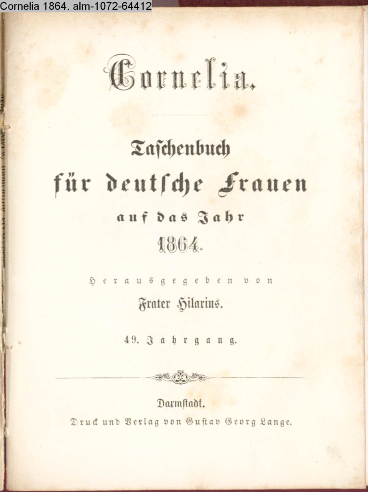 CORNELIA / TASCHENBUCH / FÜR / Deutsche Frauen / auf das / JAHR / 1864 / BEGRÜNDET / VON / ALOYS SCHREIBER / und / fortgesetzt / von Frater Hilarius / 49r JAHRGANG / DARMSTADT / DRUCK & VERLAG v. GUSTAV GEORG LANGE
