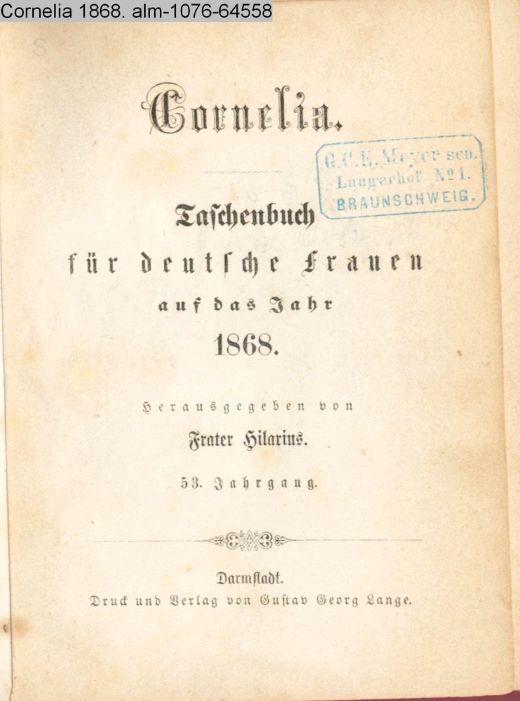 CORNELIA / TASCHENBUCH / FÜR / Deutsche Frauen / auf das / JAHR / 1868 / BEGRÜNDET / VON / ALOYS SCHREIBER / und / fortgesetzt / von Frater Hilarius / 53r JAHRGANG / DARMSTADT / DRUCK & VERLAG v. GUSTAV GEORG LANGE
