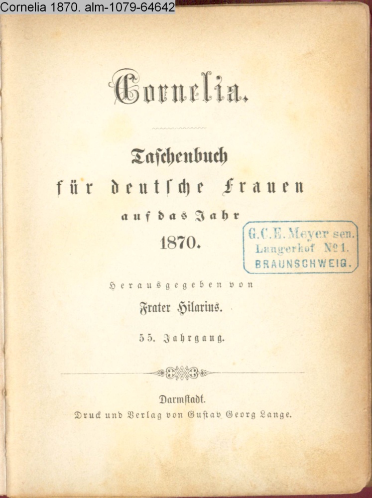 CORNELIA / TASCHENBUCH / FÜR / Deutsche Frauen / auf das / JAHR / 1870 / BEGRÜNDET / VON / ALOYS SCHREIBER / und / fortgesetzt / von Frater Hilarius / 55r JAHRGANG / DARMSTADT / DRUCK & VERLAG v. GUSTAV GEORG LANGE
