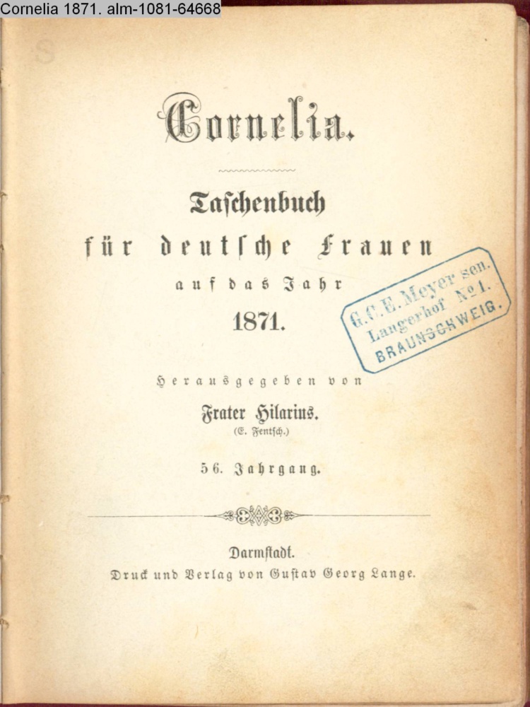CORNELIA / TASCHENBUCH / FÜR / Deutsche Frauen / auf das / JAHR / 1871 / BEGRÜNDET / VON / ALOYS SCHREIBER / und / fortgesetzt / von Frater Hilarius / 56r JAHRGANG / DARMSTADT / DRUCK & VERLAG v. GUSTAV GEORG LANGE