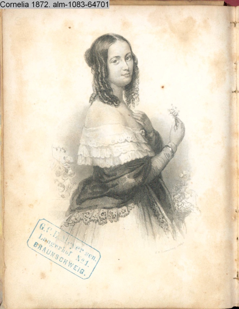 CORNELIA / TASCHENBUCH / FÜR / Deutsche Frauen / auf das / JAHR / 1872 / BEGRÜNDET / VON / ALOYS SCHREIBER / und / fortgesetzt / von Frater Hilarius / 57r JAHRGANG / DARMSTADT / DRUCK & VERLAG v. GUSTAV GEORG LANGE