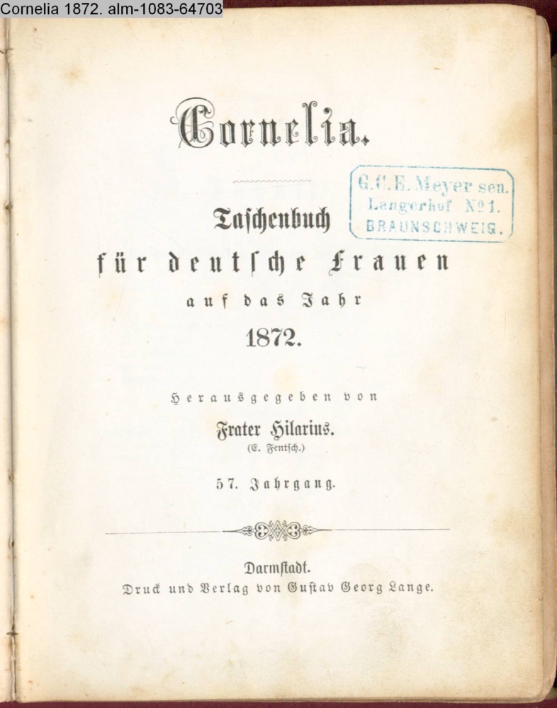 CORNELIA / TASCHENBUCH / FÜR / Deutsche Frauen / auf das / JAHR / 1872 / BEGRÜNDET / VON / ALOYS SCHREIBER / und / fortgesetzt / von Frater Hilarius / 57r JAHRGANG / DARMSTADT / DRUCK & VERLAG v. GUSTAV GEORG LANGE