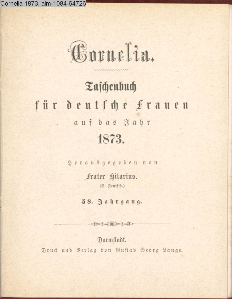 CORNELIA / TASCHENBUCH / FÜR / Deutsche Frauen / auf das / JAHR / 1873 / BEGRÜNDET / VON / ALOYS SCHREIBER / und / fortgesetzt / von Frater Hilarius / 58r JAHRGANG / DARMSTADT / DRUCK & VERLAG v. GUSTAV GEORG LANGE