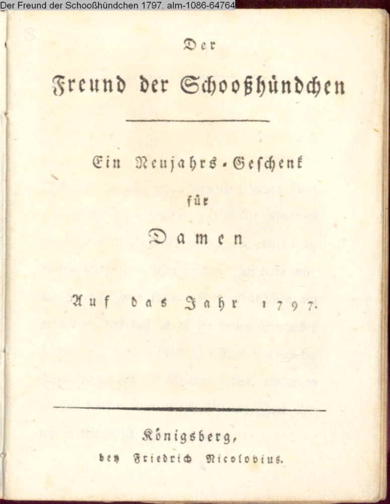 Der / Freund der Schooßhündchen / Ein Neujahrs-Geschenk / für / Damen / Auf das Jahr 1797. / Königsberg, / bey Friedrich Nicolovius
