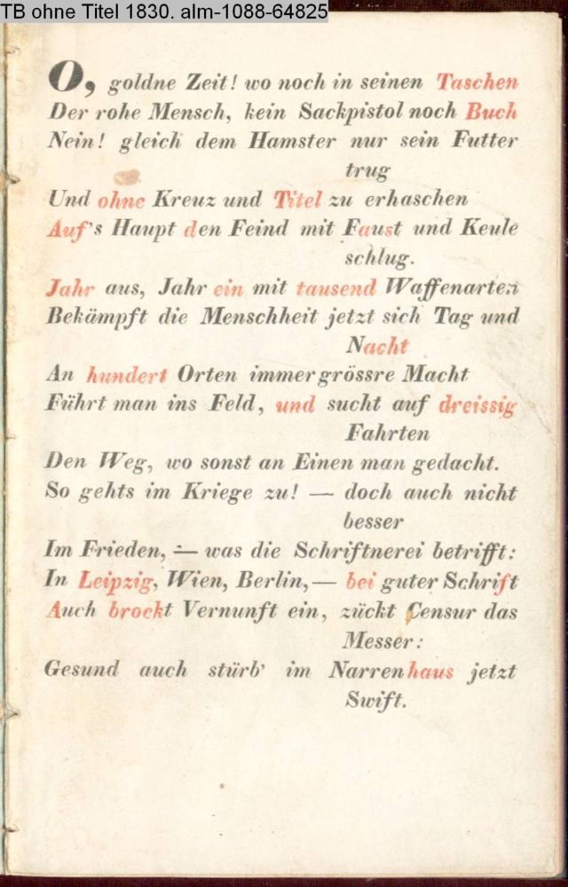 O, goldne Zeit! wo noch in seinen Taschen / Der rohe Mensch, kein Sackpistol noch Buch / Nein! gleich dem Hamster nur sein Futter / trug…