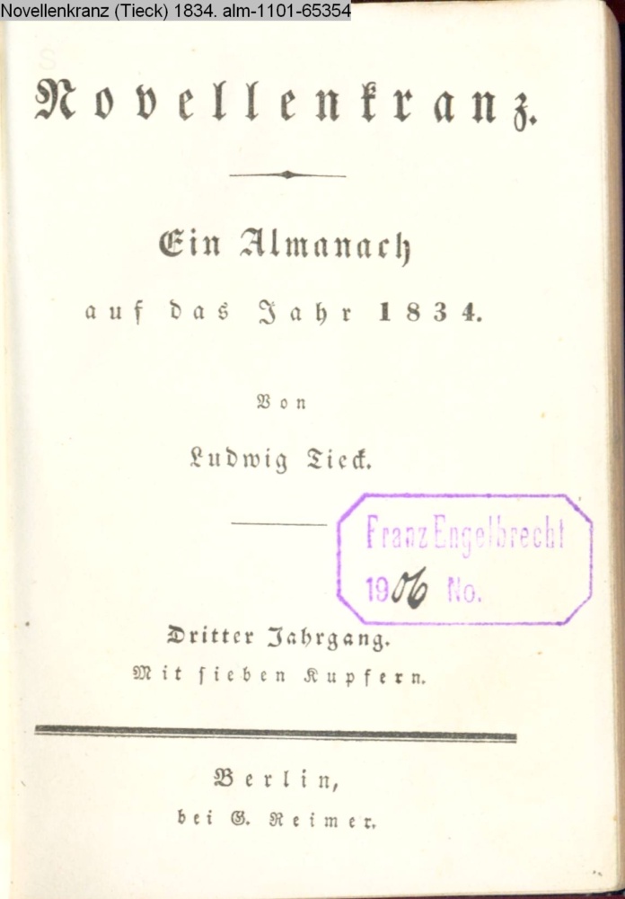 Novellenkranz. / Ein Almanach / auf das Jahr 1834. / Von / Ludwig Tieck. / Dritter Jahrgang. / Mit sieben Kupfern. / Berlin, / bei G. Reimer