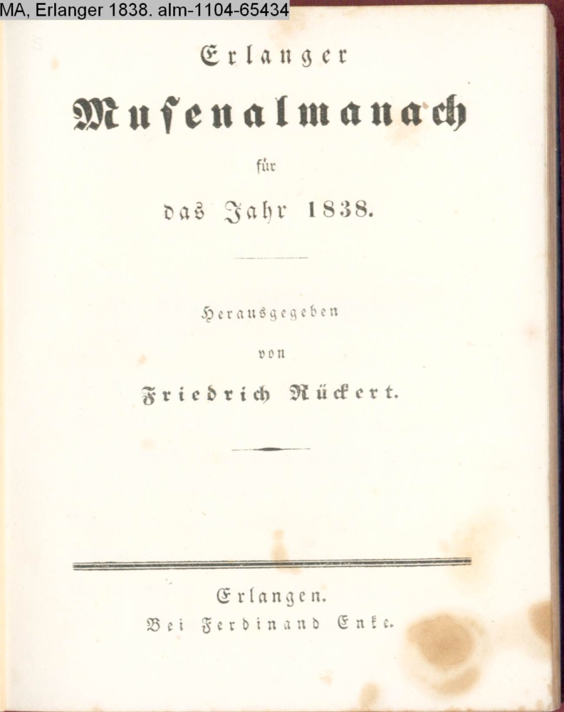 Erlanger / Musenalmanach / für / das Jahr 1838. / Herausgegeben / von / Friedrich Rückert. / Erlangen. / Bei Ferdinand Enke