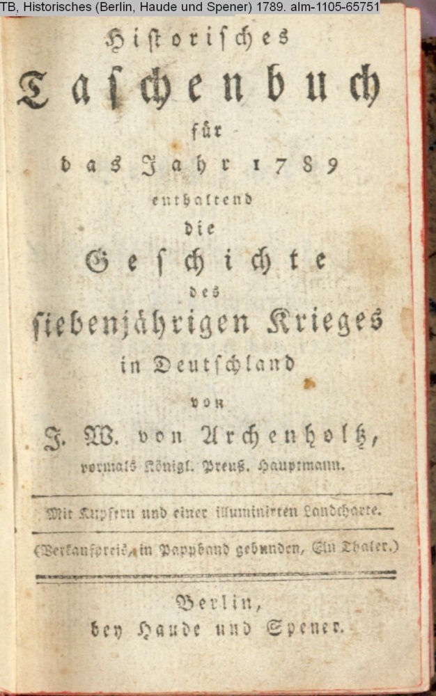 Historisches / Taschenbuch / für / das Jahr 1789 / enthaltend / die / Geschichte / des / siebenjährigen Krieges / in Deutschland / von / J. W. von Archenholtz, / vormals Königl. Preuß. Hauptmann. / Mit Kupfern und einer illuminirten Landcharte. / (Verkaufspreis, in Pappband gebunden, Ein Thaler.) / Berlin, / bey Haude und Spener