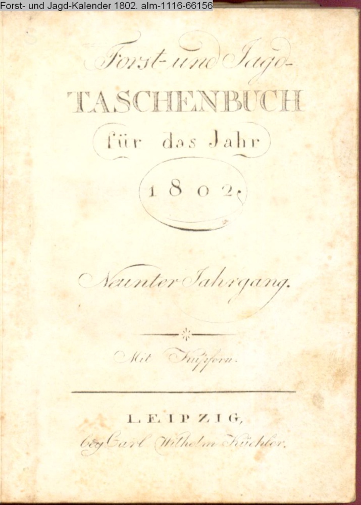Forst- und Jagd- / TASCHENBUCH / für das Jahr / 1802. / Neunter Jahrgang. / Mit Kupfern. / LEIPZIG, / bey Carl Wilhelm Küchler