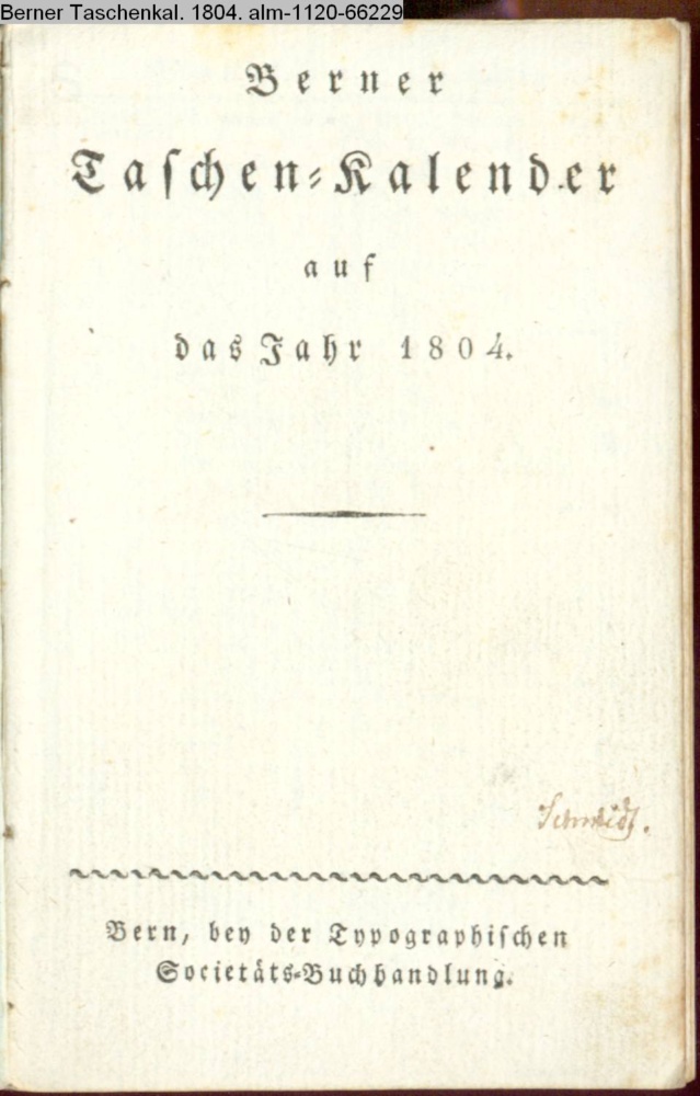 Berner / Taschen-Kalender / auf / das Jahr 1804. / Bern, bey der Typographischen / Societäts-Buchhandlung