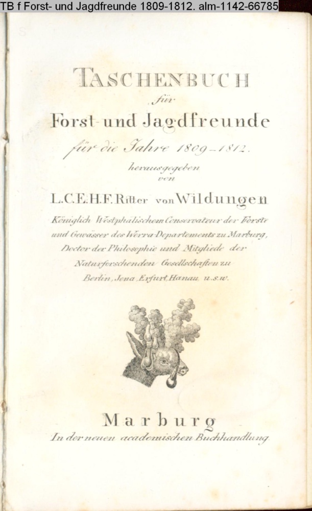 TASCHENBUCH / für / Forst- und Jagdfreunde / für die Jahre / 1809-1812. / herausgegeben / von / L. C. E. H. F. Ritter von Wildungen / Königlich Westphälischem Conservateur der Forste / und Gewässer des Werra-Departements zu Marburg, / Doctor der Philosophie und Mitgliede der / Naturforschenden Gesellschaften zu / Berlin, Jena, Erfurt, Hanau u.s.w. / Marburg / In der neuen academischen Buchhandlung