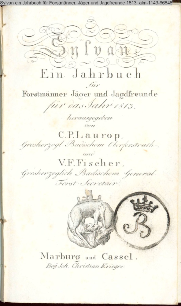 Sylvan. / Ein Jahrbuch / für / Forstmänner Jäger und Jagdfreunde / für das Jahr 1813. / herausgegeben / von / C. P. Laurop, / Grosherzogl. Badischem Oberforstrath / V. F. Fischer, / Grosherzoglich Badischem General- / Forst-Secretair. / Marburg und Cassel. / Bey Joh. Christian Krieger