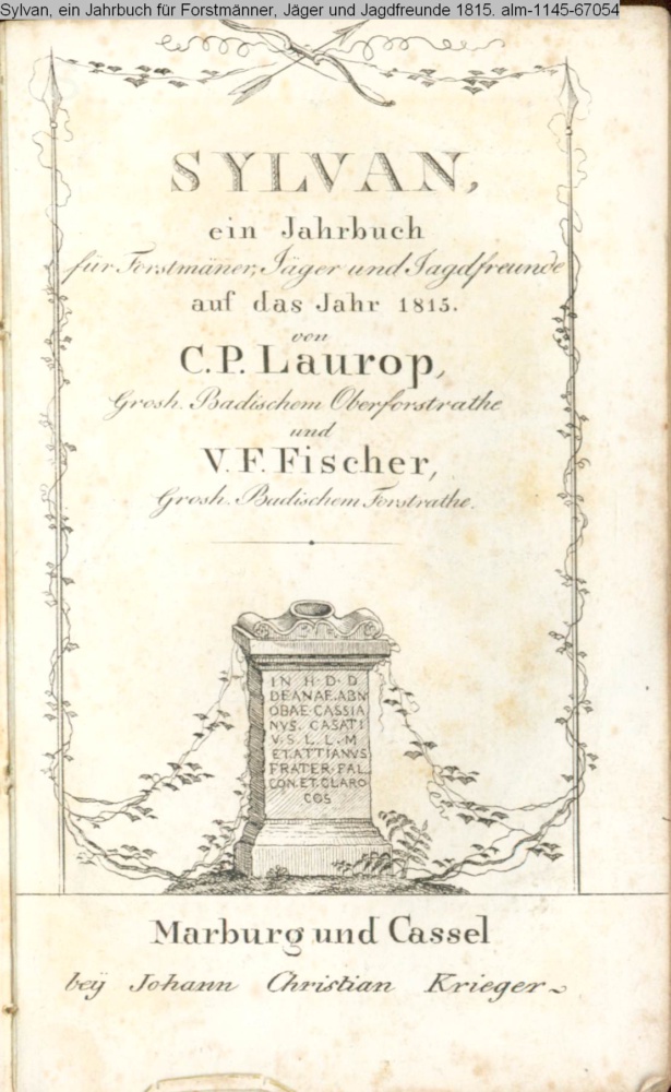 SYLVAN, / ein Jahrbuch / für / Forstmänner, Jäger und Jagdfreunde / auf das Jahr 1815. / von / C. P. Laurop, / Grosh. Badischem Oberforstrathe / und / V. F. Fischer, / Grosh. Badischem / Forstrathe. / Marburg und Cassel / bey Johann Christian Krieger
