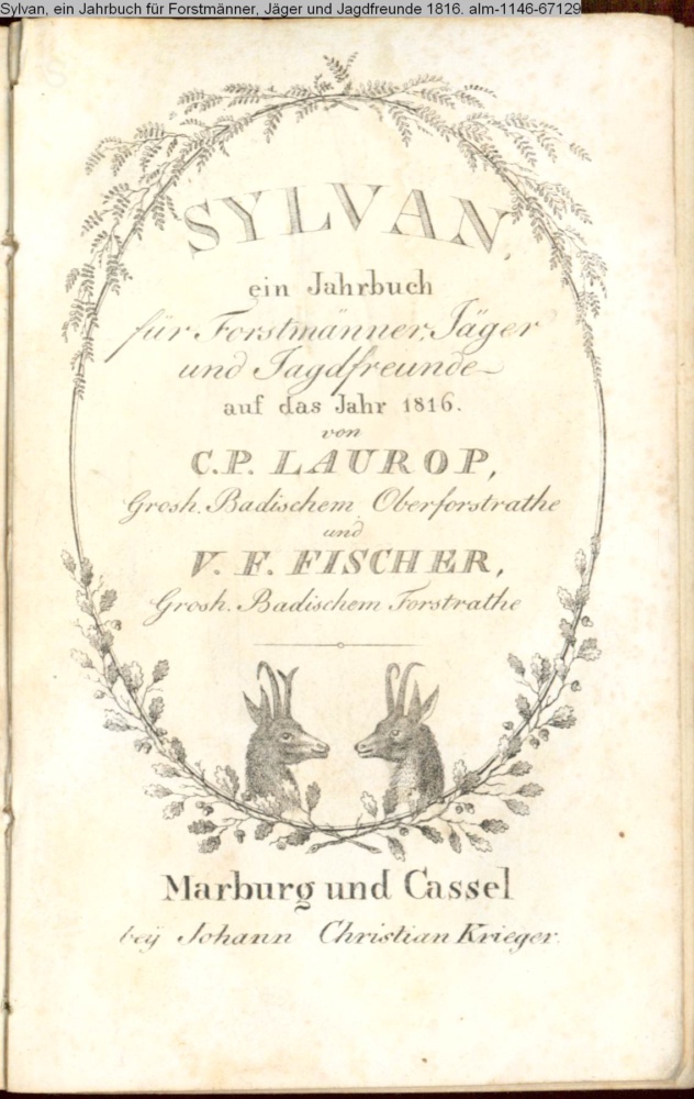 SYLVAN, / ein Jahrbuch / für Forstmänner, Jäger / und Jagdfreunde / auf das Jahr 1816. / von / C. P. LAUROP, / Grosh. Badischem Oberforstrathe / und / V. F. FISCHER. / Grosh. Badischem Forstrathe / Marburg und Cassel / bey Johann Christian Krieger