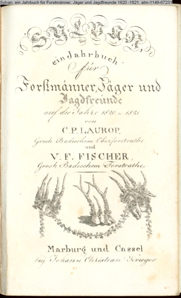 SYLVAN, / ein Jahrbuch / für Forstmänner, Jäger / und Jagdfreunde / auf das Jahr 1816. / von / C. P. LAUROP, / Grosh. Badischem Oberforstrathe / und / V. F. FISCHER. / Grosh. Badischem Forstrathe / Marburg und Cassel / bey Johann Christian Krieger