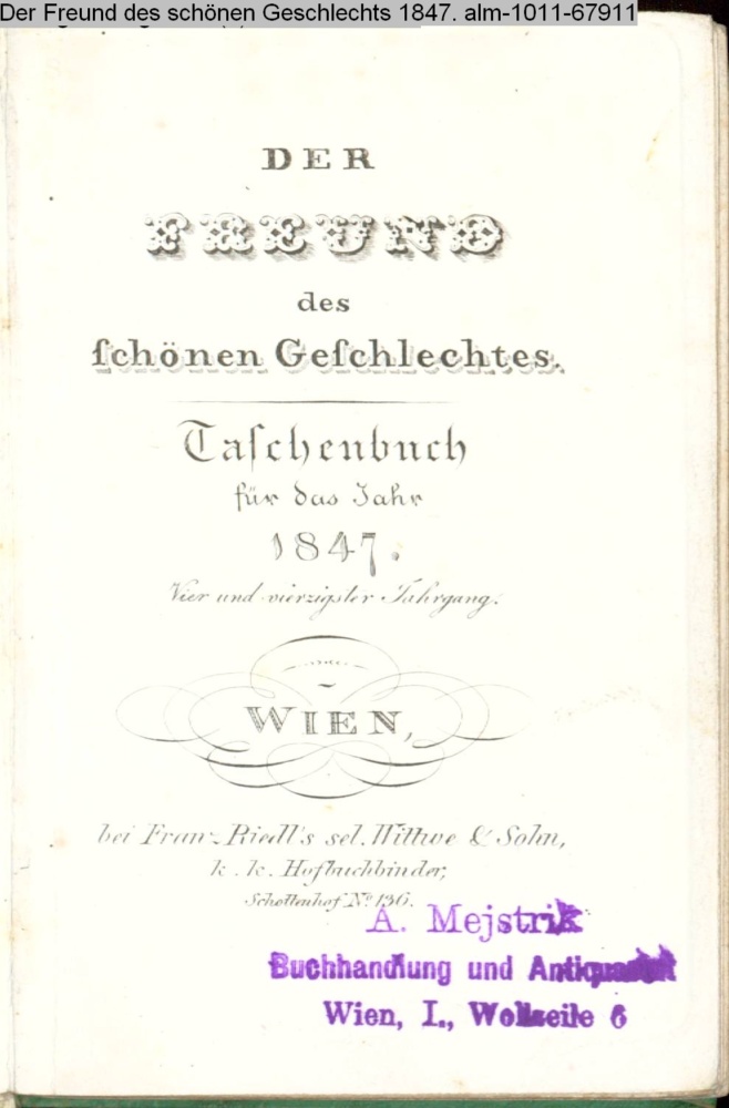 DER / FREUND / des / schönen Geschlechtes. / Taschenbuch / für das Jahr / 1847. / Vier und vierzigster Jahrgang. / WIEN, / bei Franz Riedl's sel. Wittwe & Sohn, / k.k. Hofbuchbinder, / Schottenhof No. 136