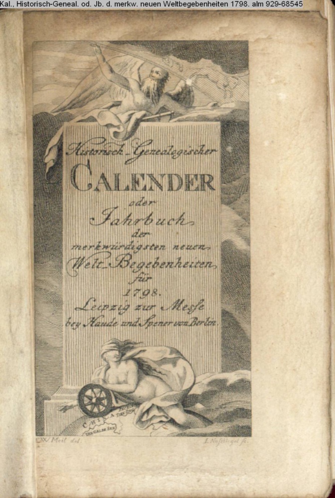 Historisch-Genealogischer / CALENDER / oder / Jahrbuch / der / merkwürdigsten neuen / Welt-Begebenheiten / für / 1798. / Leipzig zur Messe / bey Haude und Spener von Berlin