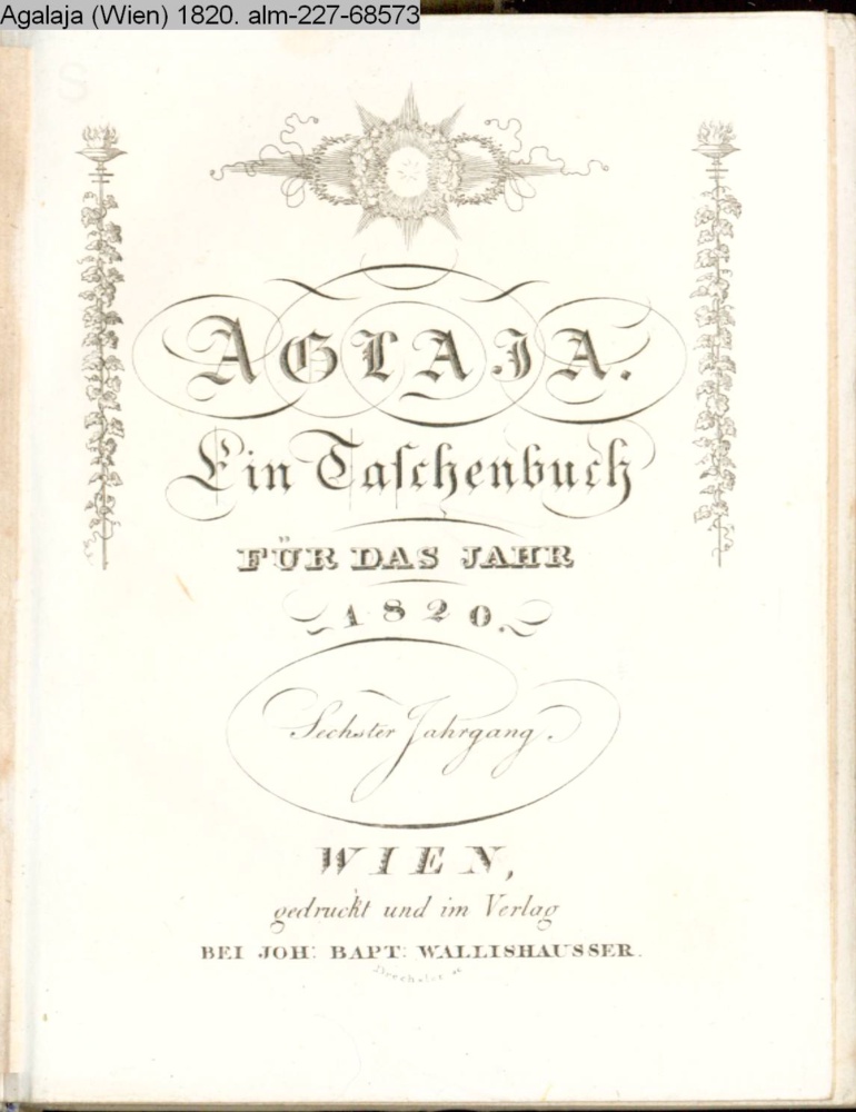 AGLAJA. / Ein Taschenbuch / FÜR DAS JAHR / 1820. / Sechster Jahrgang. / WIEN, / gedruckt und im Verlag / BEI JOH. BAPT. WALLISHAUSSER