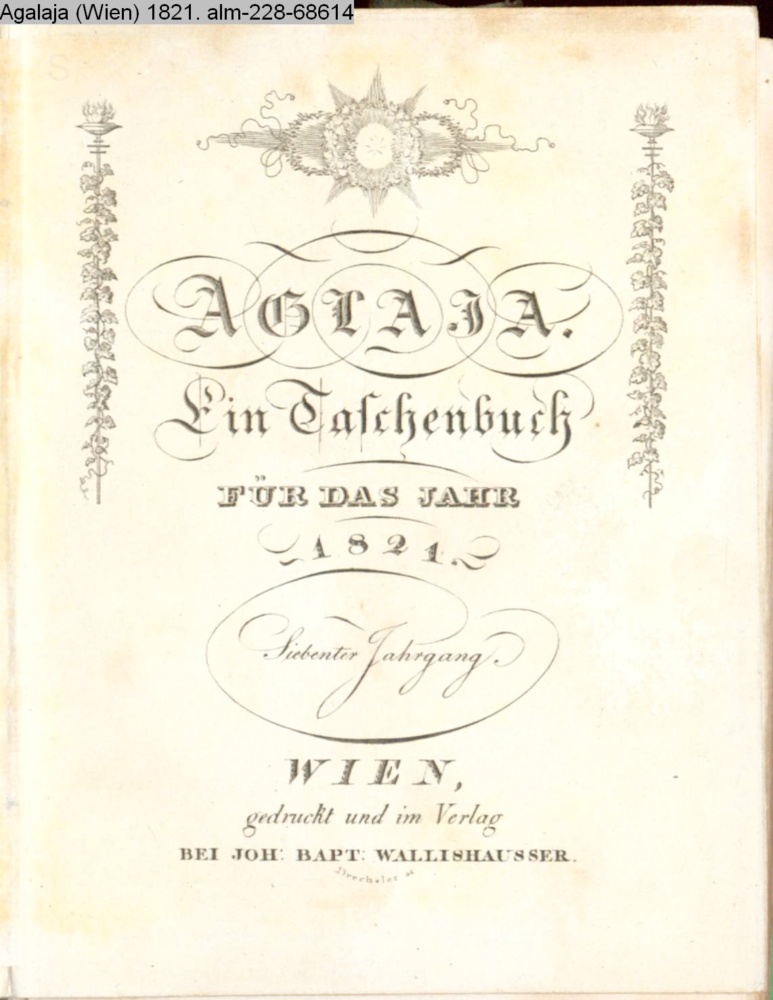 AGLAJA. / Ein Taschenbuch / FÜR DAS JAHR / 1821. / Siebenter Jahrgang. / WIEN, / gedruckt und im Verlag / BEI JOH. BAPT. WALLISHAUSSER