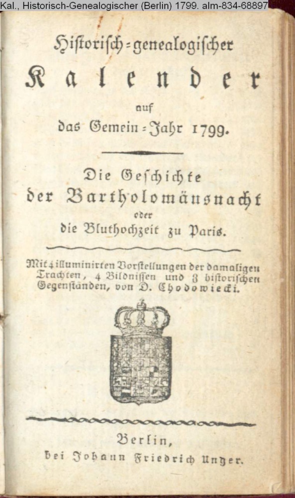 Historisch-genealogischer / Kalender / auf / das Gemein-Jahr 1799. / Die Geschichte / der Bartholomäusnacht / oder / die Bluthochzeit zu Paris. / Mit 4 illuminirten Vorstellungen der damaligen / Trachten, 4 Bildnissen und 8 historischen / Gegenständen, von D. Chodowiecki. / Berlin, bei Johann Friedrich Unger